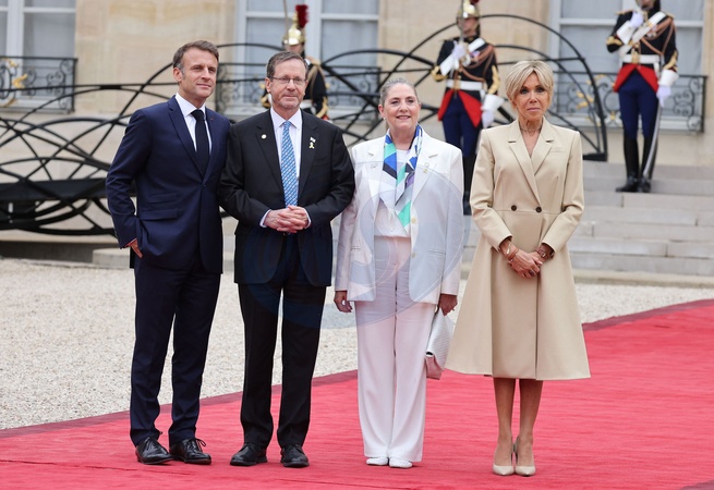 Isaac Herzog (Président d'Israël) et sa femme Michal - Emmanuel Macron, Président de la République Française, et la Première dame Brigitte Macron, accueillent les chefs d'Etat et de gouvernement présents à Paris pour la cérémonie d'ouverture des Jeux Olympiques de Paris 2024 (JO). Cette réception sera l'occasion pour la France de délivrer un message de paix et de tolérance alors que 10500 athlètes du monde entier seront réunis pour participer au plus grand événement sportif international. Paris, le 26 juillet 2024. © Dominique Jacovides/Bestimage Emmanuel Macron, President of the French Republic, and the First Lady Brigitte Maron, welcome the heads of state and government present in Paris for the opening ceremony of the Paris 2024 Olympic Games (Olympics). This reception will be an opportunity for France to deliver a message of peace and tolerance as 10,500 athletes from around the world gather to participate in the largest international sporting event. Paris, July 26th, 2024.