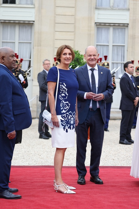 Olaf Scholz (chancelier d'Allemagne) et sa femme Britta Ernst - Emmanuel Macron, Président de la République Française, et la Première dame Brigitte Macron, accueillent les chefs d'Etat et de gouvernement présents à Paris pour la cérémonie d'ouverture des Jeux Olympiques de Paris 2024 (JO). Cette réception sera l'occasion pour la France de délivrer un message de paix et de tolérance alors que 10500 athlètes du monde entier seront réunis pour participer au plus grand événement sportif international. Paris, le 26 juillet 2024. © Dominique Jacovides- Pierre Perusseau /Bestimage Emmanuel Macron, President of the French Republic, and the First Lady Brigitte Maron, welcome the heads of state and government present in Paris for the opening ceremony of the Paris 2024 Olympic Games (Olympics). This reception will be an opportunity for France to deliver a message of peace and tolerance as 10,500 athletes from around the world gather to participate in the largest international sporting event. Paris, July 26th, 2024.