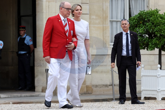Le prince Albert II de Monaco et la princesse Charlène de Monaco- Emmanuel Macron, Président de la République Française, et la Première dame Brigitte Macron, accueillent les chefs d'Etat et de gouvernement présents à Paris pour la cérémonie d'ouverture des Jeux Olympiques de Paris 2024 (JO). Cette réception sera l'occasion pour la France de délivrer un message de paix et de tolérance alors que 10500 athlètes du monde entier seront réunis pour participer au plus grand événement sportif international. Paris, le 26 juillet 2024. © Stéphane Lemouton / Bestimage Emmanuel Macron, President of the French Republic, and the First Lady Brigitte Maron, welcome the heads of state and government present in Paris for the opening ceremony of the Paris 2024 Olympic Games (Olympics). This reception will be an opportunity for France to deliver a message of peace and tolerance as 10,500 athletes from around the world gather to participate in the largest international sporting event. Paris, July 26th, 2024. © Stéphane Lemouton / Bestimage