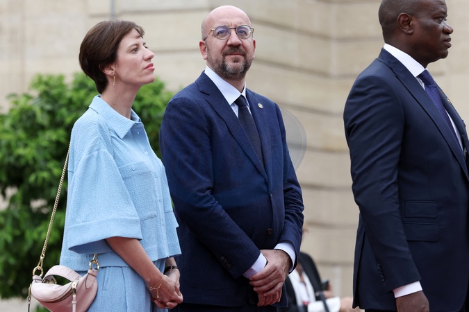Charles Michel et son épouse Amélie Derbaudrenghier - Emmanuel Macron, Président de la République Française, et la Première dame Brigitte Macron, accueillent les chefs d'Etat et de gouvernement présents à Paris pour la cérémonie d'ouverture des Jeux Olympiques de Paris 2024 (JO). Cette réception sera l'occasion pour la France de délivrer un message de paix et de tolérance alors que 10500 athlètes du monde entier seront réunis pour participer au plus grand événement sportif international. Paris, le 26 juillet 2024. © Stéphane Lemouton / Bestimage Emmanuel Macron, President of the French Republic, and the First Lady Brigitte Maron, welcome the heads of state and government present in Paris for the opening ceremony of the Paris 2024 Olympic Games (Olympics). This reception will be an opportunity for France to deliver a message of peace and tolerance as 10,500 athletes from around the world gather to participate in the largest international sporting event. Paris, July 26th, 2024. © Stéphane Lemouton / Bestimage