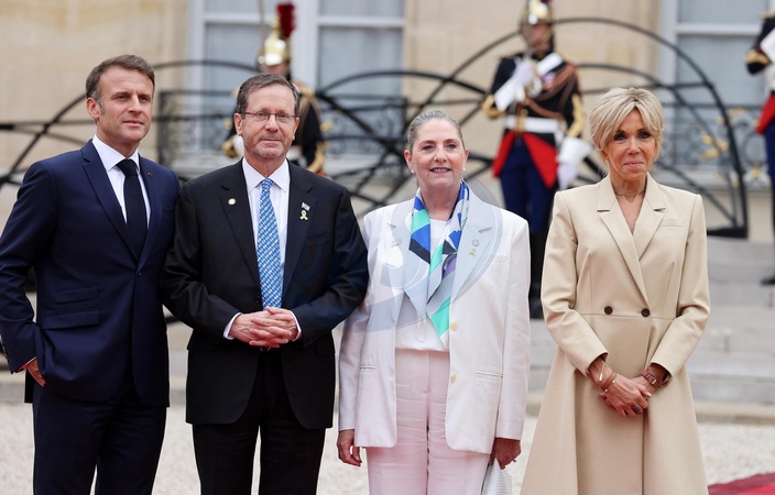 Emmanuel Macron, Isaac Herzog, Président d'Israël et sa femme, Brigitte Macron - Emmanuel Macron, Président de la République Française, et la Première dame Brigitte Macron, accueillent les chefs d'Etat et de gouvernement présents à Paris pour la cérémonie d'ouverture des Jeux Olympiques de Paris 2024 (JO). Cette réception sera l'occasion pour la France de délivrer un message de paix et de tolérance alors que 10500 athlètes du monde entier seront réunis pour participer au plus grand événement sportif international. Paris, le 26 juillet 2024. © Dominique Jacovides - Pierre Perusseau / Bestimage Emmanuel Macron, President of the French Republic, and the First Lady Brigitte Maron, welcome the heads of state and government present in Paris for the opening ceremony of the Paris 2024 Olympic Games (Olympics). This reception will be an opportunity for France to deliver a message of peace and tolerance as 10,500 athletes from around the world gather to participate in the largest international sporting event. Paris, July 26th, 2024.