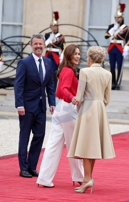 Emmanuel Macron, le Roi Frederik de Danemark et la Reine Mary, Brigitte Macron - Emmanuel Macron, Président de la République Française, et la Première dame Brigitte Macron, accueillent les chefs d'Etat et de gouvernement présents à Paris pour la cérémonie d'ouverture des Jeux Olympiques de Paris 2024 (JO). Cette réception sera l'occasion pour la France de délivrer un message de paix et de tolérance alors que 10500 athlètes du monde entier seront réunis pour participer au plus grand événement sportif international. Paris, le 26 juillet 2024. © Dominique Jacovides - Pierre Perusseau / Bestimage Emmanuel Macron, President of the French Republic, and the First Lady Brigitte Maron, welcome the heads of state and government present in Paris for the opening ceremony of the Paris 2024 Olympic Games (Olympics). This reception will be an opportunity for France to deliver a message of peace and tolerance as 10,500 athletes from around the world gather to participate in the largest international sporting event. Paris, July 26th, 2024.