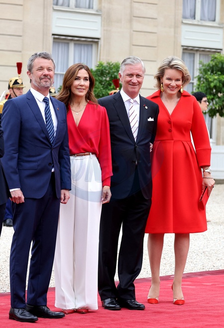 Le Roi Frederik de Danemark, la Reine Mary de Danemark, le Roi Philippe de Belgique et la Reine Mathilde - Emmanuel Macron, Président de la République Française, et la Première dame Brigitte Macron, accueillent les chefs d'Etat et de gouvernement présents à Paris pour la cérémonie d'ouverture des Jeux Olympiques de Paris 2024 (JO). Cette réception sera l'occasion pour la France de délivrer un message de paix et de tolérance alors que 10500 athlètes du monde entier seront réunis pour participer au plus grand événement sportif international. Paris, le 26 juillet 2024. © Dominique Jacovides - Pierre Perusseau / Bestimage Emmanuel Macron, President of the French Republic, and the First Lady Brigitte Maron, welcome the heads of state and government present in Paris for the opening ceremony of the Paris 2024 Olympic Games (Olympics). This reception will be an opportunity for France to deliver a message of peace and tolerance as 10,500 athletes from around the world gather to participate in the largest international sporting event. Paris, July 26th, 2024.