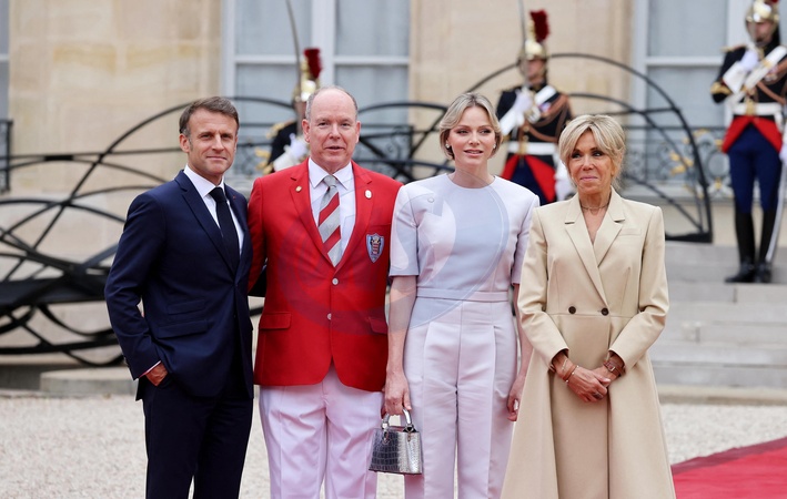 Emmanuel Macron, Albert II de Monaco, Charlene de Monaco, Brigitte Macron - Emmanuel Macron, Président de la République Française, et la Première dame Brigitte Macron, accueillent les chefs d'Etat et de gouvernement présents à Paris pour la cérémonie d'ouverture des Jeux Olympiques de Paris 2024 (JO). Cette réception sera l'occasion pour la France de délivrer un message de paix et de tolérance alors que 10500 athlètes du monde entier seront réunis pour participer au plus grand événement sportif international. Paris, le 26 juillet 2024. © Dominique Jacovides - Pierre Perusseau / Bestimage Emmanuel Macron, President of the French Republic, and the First Lady Brigitte Maron, welcome the heads of state and government present in Paris for the opening ceremony of the Paris 2024 Olympic Games (Olympics). This reception will be an opportunity for France to deliver a message of peace and tolerance as 10,500 athletes from around the world gather to participate in the largest international sporting event. Paris, July 26th, 2024.