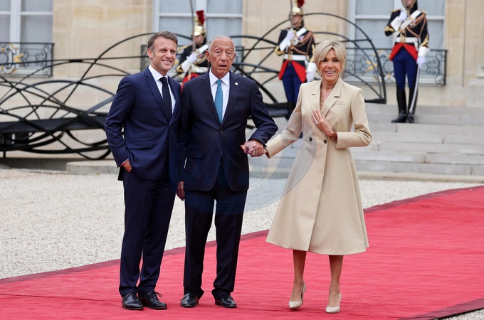 Emmanuel Macron, Marcelo Rebelo de Sousa, Président de la République portugaise, Brigitte Macron - Emmanuel Macron, Président de la République Française, et la Première dame Brigitte Macron, accueillent les chefs d'Etat et de gouvernement présents à Paris pour la cérémonie d'ouverture des Jeux Olympiques de Paris 2024 (JO). Cette réception sera l'occasion pour la France de délivrer un message de paix et de tolérance alors que 10500 athlètes du monde entier seront réunis pour participer au plus grand événement sportif international. Paris, le 26 juillet 2024. © Dominique Jacovides - Pierre Perusseau / Bestimage Emmanuel Macron, President of the French Republic, and the First Lady Brigitte Maron, welcome the heads of state and government present in Paris for the opening ceremony of the Paris 2024 Olympic Games (Olympics). This reception will be an opportunity for France to deliver a message of peace and tolerance as 10,500 athletes from around the world gather to participate in the largest international sporting event. Paris, July 26th, 2024.