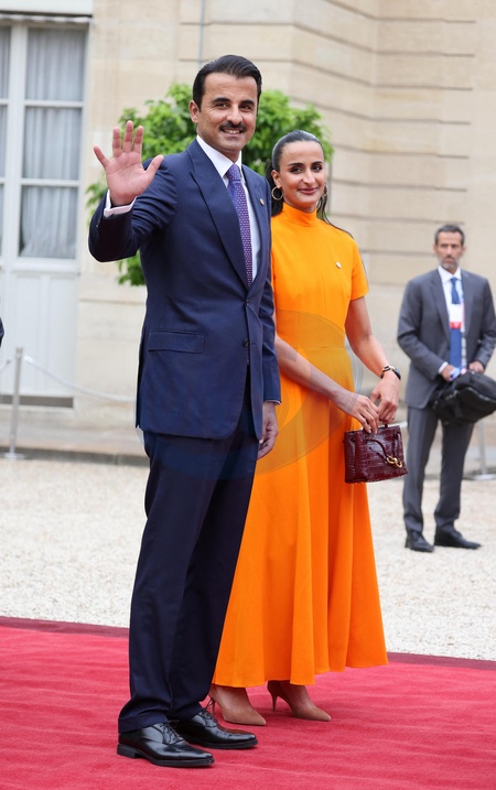 L'Émir du Qatar Cheikh Tamim bin Hamad bin Khalifa Al Thani et Cheikha Hind bint Hamad bin Khalifa al-Thani - Emmanuel Macron, Président de la République Française, et la Première dame Brigitte Macron, accueillent les chefs d'Etat et de gouvernement présents à Paris pour la cérémonie d'ouverture des Jeux Olympiques de Paris 2024 (JO). Cette réception sera l'occasion pour la France de délivrer un message de paix et de tolérance alors que 10500 athlètes du monde entier seront réunis pour participer au plus grand événement sportif international. Paris, le 26 juillet 2024. © Dominique Jacovides - Pierre Perusseau / Bestimage Emmanuel Macron, President of the French Republic, and the First Lady Brigitte Maron, welcome the heads of state and government present in Paris for the opening ceremony of the Paris 2024 Olympic Games (Olympics). This reception will be an opportunity for France to deliver a message of peace and tolerance as 10,500 athletes from around the world gather to participate in the largest international sporting event. Paris, July 26th, 2024.