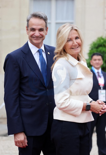 Kyriákos Mitsotákis, Premier ministre de Grèce et sa femme - Emmanuel Macron, Président de la République Française, et la Première dame Brigitte Macron, accueillent les chefs d'Etat et de gouvernement présents à Paris pour la cérémonie d'ouverture des Jeux Olympiques de Paris 2024 (JO). Cette réception sera l'occasion pour la France de délivrer un message de paix et de tolérance alors que 10500 athlètes du monde entier seront réunis pour participer au plus grand événement sportif international. Paris, le 26 juillet 2024. © Dominique Jacovides - Pierre Perusseau / Bestimage Emmanuel Macron, President of the French Republic, and the First Lady Brigitte Maron, welcome the heads of state and government present in Paris for the opening ceremony of the Paris 2024 Olympic Games (Olympics). This reception will be an opportunity for France to deliver a message of peace and tolerance as 10,500 athletes from around the world gather to participate in the largest international sporting event. Paris, July 26th, 2024.