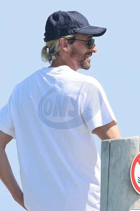 Adrien Brody et sa compagne Georgina Chapman s'embrassent en arrivant au Club 55 à Saint-Tropez le 27 juillet 2024 Adrien Brody and his partner Georgina Chapman kiss upon arriving at Club 55 in Saint-Tropez on July 27, 2024