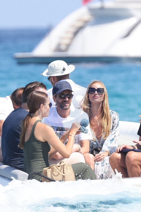 Adrien Brody et sa compagne Georgina Chapman s'embrassent en arrivant au Club 55 à Saint-Tropez le 27 juillet 2024 Adrien Brody and his partner Georgina Chapman kiss upon arriving at Club 55 in Saint-Tropez on July 27, 2024