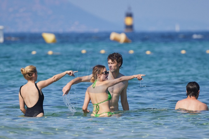 Exclusif - Prix Spécial - No Web - Ashley Benson, son mari Brandon Davis, Emma Roberts et son fiancé Cody John s'amusent comme de grands enfants sur une plage pendant leurs vacances dans le golfe de Saint-Tropez, Côte d'Azur, France, le 25 juillet 2025. Exclusive - For Germany Call For Prize - Must Call For Pricing Before Usage - Ashley Benson, her husband Brandon Davis, Emma Roberts and her companion Cody John have fun like big kids on a beach during their vacation in the Gulf of Saint-Tropez, French Riviera, France, on July 25, 2025.