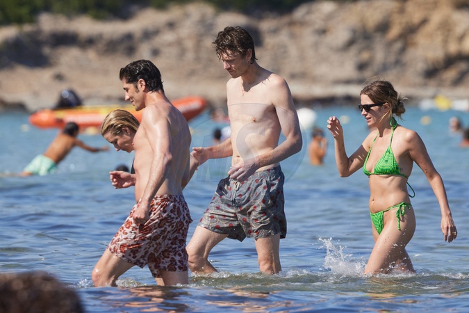 Exclusif - Prix Spécial - No Web - Ashley Benson, son mari Brandon Davis, Emma Roberts et son fiancé Cody John s'amusent comme de grands enfants sur une plage pendant leurs vacances dans le golfe de Saint-Tropez, Côte d'Azur, France, le 25 juillet 2025. Exclusive - For Germany Call For Prize - Must Call For Pricing Before Usage - Ashley Benson, her husband Brandon Davis, Emma Roberts and her companion Cody John have fun like big kids on a beach during their vacation in the Gulf of Saint-Tropez, French Riviera, France, on July 25, 2025.