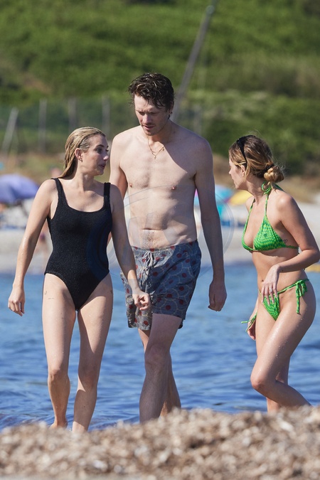 Exclusif - Prix Spécial - No Web - Ashley Benson, son mari Brandon Davis, Emma Roberts et son fiancé Cody John s'amusent comme de grands enfants sur une plage pendant leurs vacances dans le golfe de Saint-Tropez, Côte d'Azur, France, le 25 juillet 2025. Exclusive - For Germany Call For Prize - Must Call For Pricing Before Usage - Ashley Benson, her husband Brandon Davis, Emma Roberts and her companion Cody John have fun like big kids on a beach during their vacation in the Gulf of Saint-Tropez, French Riviera, France, on July 25, 2025.