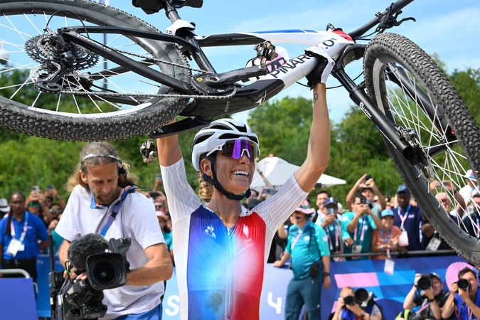 Pauline Ferrand-Prévot décroche la médaille d'or en VTT cross-country lors des Jeux Olympiques 2024 (JO 2024) à Élancourt dans les Yvelines