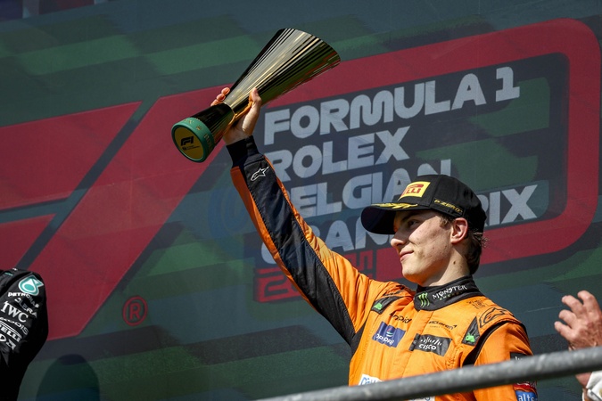 George Russell remporte le grand prix de Belgique de Formule 1 (F1) à Spa-Francorchamps - PIASTRI Oscar (aus), McLaren F1 Team MCL38, portrait, podium during the Formula 1 Rolex Belgian Grand Prix 2024, 14th round of the 2024 Formula One World Championship from July 26 to 28, 2024 on the Circuit de Spa-Francorchamps, in Stavelot, Belgium -