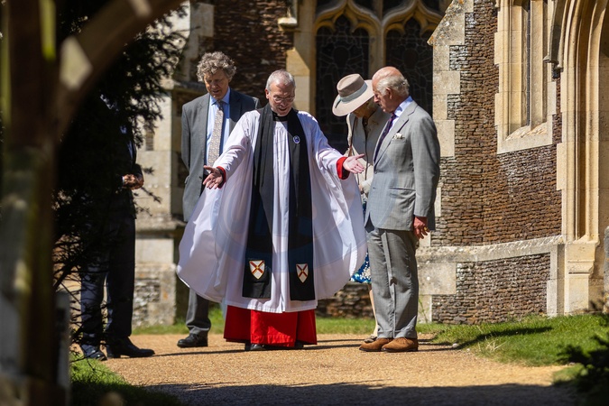 Pictured Reverend Canon Paul Williams and the King. His Majesty King Charles III Leaves Sunday Service in the Grounds of Sandringham House., Mary Magdalene Church, Sandringham Sunday 28 July 2024., Credit:Terry Harris / Avalon
