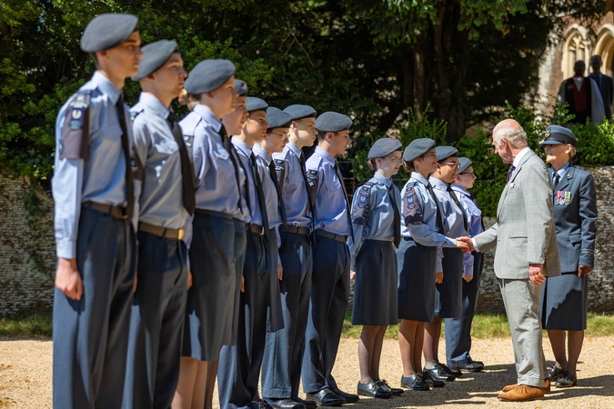 Pictured The Kings Greets Flight lieutenant Pauline Petch who has overseen 42F (King's Lynn, Estate 1939 ) Squadron Air Training Corps Venture Adventure for 20 years. His Majesty King Charles III Leaves Sunday Service in the Grounds of Sandringham House., Mary Magdalene Church, Sandringham Sunday 28 July 2024., Credit:Terry Harris / Avalon