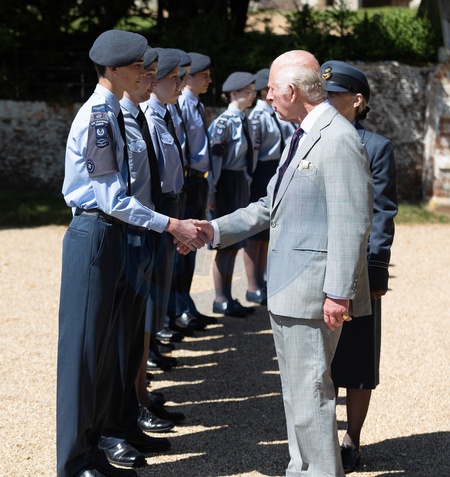 Pictured The Kings Greets Flight lieutenant Pauline Petch who has overseen 42F (King's Lynn, Estate 1939 ) Squadron Air Training Corps Venture Adventure for 20 years. His Majesty King Charles III Leaves Sunday Service in the Grounds of Sandringham House., Mary Magdalene Church, Sandringham Sunday 28 July 2024., Credit:Terry Harris / Avalon