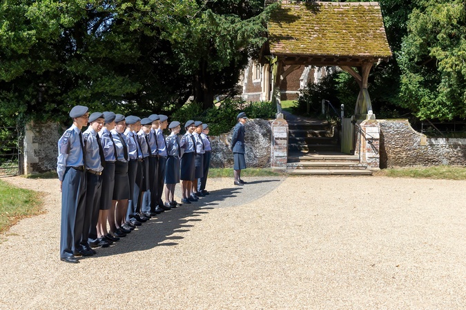 Pictured The Kings Greets Flight lieutenant Pauline Petch who has overseen 42F (King's Lynn, Estate 1939 ) Squadron Air Training Corps Venture Adventure for 20 years. His Majesty King Charles III Leaves Sunday Service in the Grounds of Sandringham House., Mary Magdalene Church, Sandringham Sunday 28 July 2024., Credit:Terry Harris / Avalon