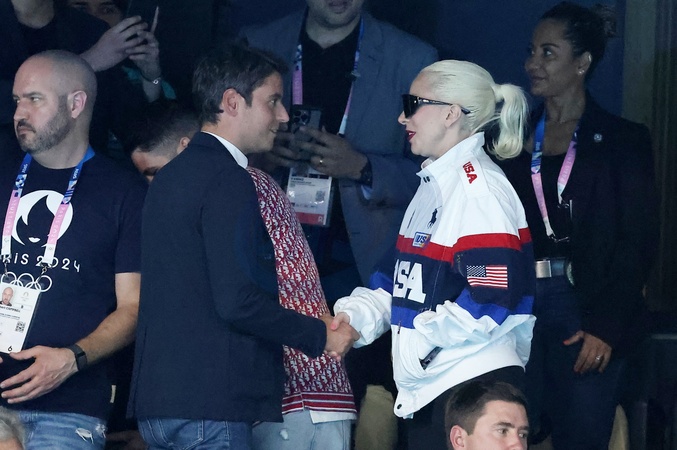 Gabriel Attal et Lady Gaga - Lady Gaga et son fiancé Michael Polansky assistent à la victoire de Léon Marchand sur 400 m 4 nage lors des Jeux Olympiques de Paris 2024 (JO) à Paris La Defense Arena à Nanterre le 28 juillet 2024. © Dominique Jacovides-Pierre Perusseau/Bestimage Lady Gaga and her fiancé Michael Polansky attend Léon Marchand's victory in the 400m medley during the Paris 2024 Olympic Games (Olympics) at Paris La Defense Arena in Nanterre on July 28, 2024.