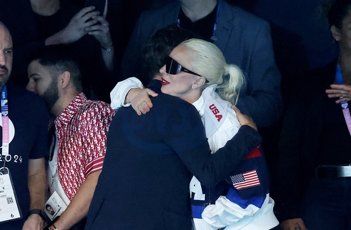 Lady Gaga i jej narzeczony Michael Polansky biorą udział w zwycięstwie Léona Marchanda w biegu na 400 m stylem zmiennym podczas Igrzysk Olimpijskich w Paryżu w 2024 r. (OG) w Paris La Defense Arena w Nanterre