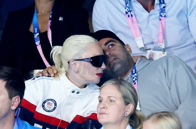 Lady Gaga i jej narzeczony Michael Polansky biorą udział w zwycięstwie Léona Marchanda w biegu na 400 m stylem zmiennym podczas Igrzysk Olimpijskich w Paryżu w 2024 r. (OG) w Paris La Defense Arena w Nanterre