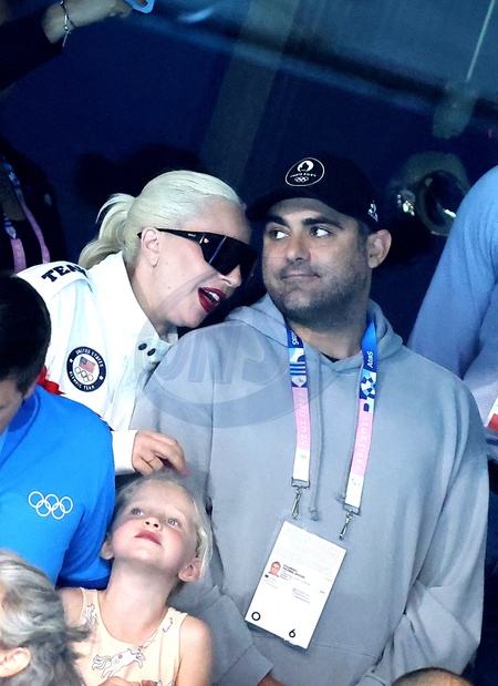 Lady Gaga et son fiancé Michael Polansky assistent à la victoire de Léon Marchand sur 400 m 4 nage lors des Jeux Olympiques de Paris 2024 (JO) à Paris La Defense Arena à Nanterre