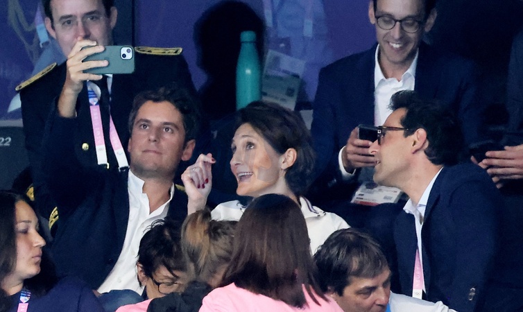 Gabriel Attal et Amélie Oudéa-Castéra - Célébrités assistent à la victoire de Léon Marchand qui devient champion Olympique sur 400 m 4 nages lors des Jeux Olympiques de Paris 2024 (JO) à Paris La Defense Arena à Nanterre le 28 juillet 2024. © Dominique Jacovides-Pierre Perusseau/Bestimage Celebrities attend the victory of Léon Marchand who becomes Olympic champion in the 400m medley during the Paris 2024 Olympic Games (Olympics) at Paris La Defense Arena in Nanterre on July 28, 2024