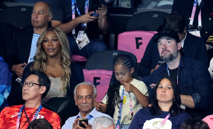 Merci de flouter le visage des enfants avant publication - Serena Williams, sa fille Olympia et son mari Alexis Ohanian - Célébrités assistent à la victoire de Léon Marchand qui devient champion Olympique sur 400 m 4 nages lors des Jeux Olympiques de Paris 2024 (JO) à Paris La Defense Arena à Nanterre le 28 juillet 2024. © Dominique Jacovides-Pierre Perusseau/Bestimage Celebrities attend the victory of Léon Marchand who becomes Olympic champion in the 400m medley during the Paris 2024 Olympic Games (Olympics) at Paris La Defense Arena in Nanterre on July 28, 2024