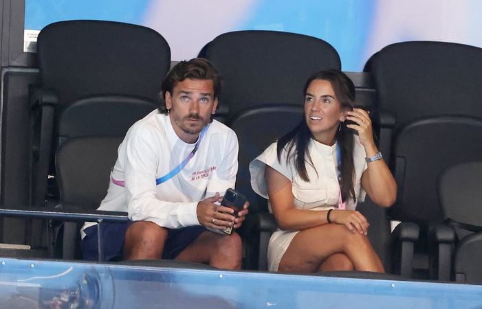 Antoine Griezmann et sa femme Erika Choperena - Célébrités assistent à la victoire de Léon Marchand qui devient champion Olympique sur 400 m 4 nages lors des Jeux Olympiques de Paris 2024 (JO) à Paris La Defense Arena à Nanterre le 28 juillet 2024. © Dominique Jacovides-Pierre Perusseau/Bestimage Celebrities attend the victory of Léon Marchand who becomes Olympic champion in the 400m medley during the Paris 2024 Olympic Games (Olympics) at Paris La Defense Arena in Nanterre on July 28, 2024