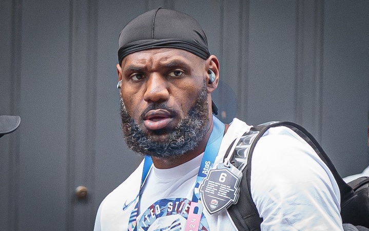 Lebron James i członkowie amerykańskiej drużyny koszykówki opuszczają hotel „L'Hermitage Gantois” w Lille z okazji Igrzysk Olimpijskich Paryż 2024
