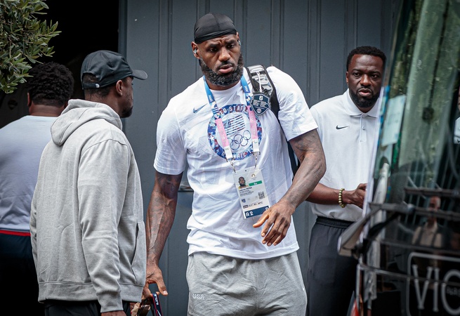 Lebron James i członkowie amerykańskiej drużyny koszykówki opuszczają hotel „L'Hermitage Gantois” w Lille z okazji Igrzysk Olimpijskich Paryż 2024
