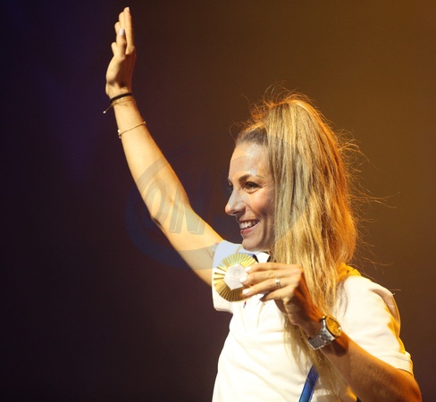 Pauline Ferrand-Prévot, médaille d'or en VTT, au Club France lors des Jeux Olympiques Paris 2024. Le 28 juillet 2024 © Jonathan Rebboah / Panoramic / Bestimage Pauline Ferrand-Prévot, gold medal in MTB, at the Club France during the Olympic Games Paris 2024. July 28, 2024