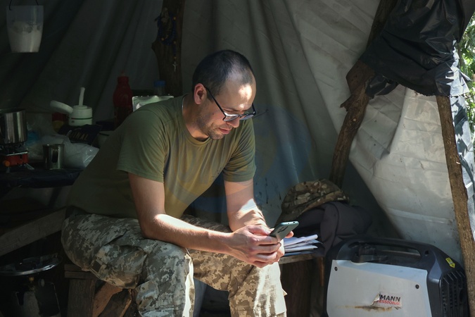 UKRAINE - JULY 26, 2024 - A Shkval (Squall) Battalion serviceman uses a smartphone. Former prisoners who volunteered to defend Ukraine and were released on parole make up most of the Shkval Special Assault Battalion of the 57th Otaman Kost Hordiienko Motorized Brigade. Currently, military personnel are undergoing training and acquiring the necessary skills. Many of them already have combat experience., Credit:Vyacheslav Madiyevskyy / Avalon