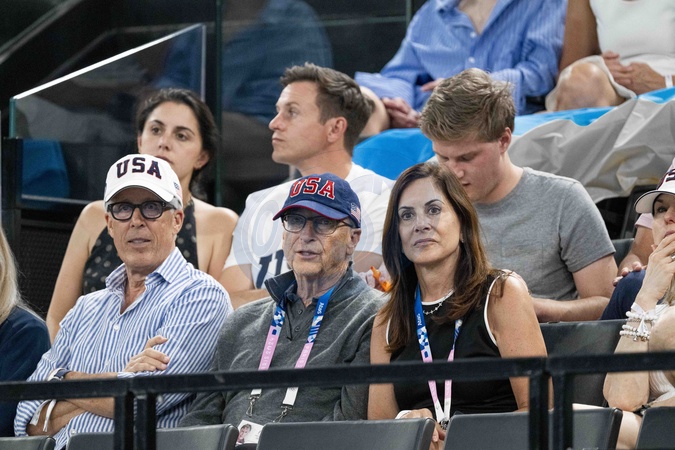 Bill Gates et son amie Paula Hurd - Célébrités assistent aux épreuves de gymnastiques lors des Jeux Olympiques de Paris 2024 (JO) au Palais omnisports Bercy Arena, à Paris le 29 juillet 2024. © Jacovides-Perusseau/Bestimage Celebrities attend the gymnastics events during the Paris 2024 Olympic Games (Olympics) at Palais Omnisports Bercy Arena in Paris on July 29, 2024.