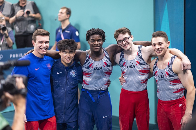 Asher Hong,Paul Juda, Brody Malone, Stephen Nedoroscik et Frederick Richard (USA) - Célébrités assistent aux épreuves de gymnastiques lors des Jeux Olympiques de Paris 2024 (JO) au Palais omnisports Bercy Arena, à Paris le 29 juillet 2024. © Jacovides-Perusseau/Bestimage Celebrities attend the gymnastics events during the Paris 2024 Olympic Games (Olympics) at Palais Omnisports Bercy Arena in Paris on July 29, 2024.