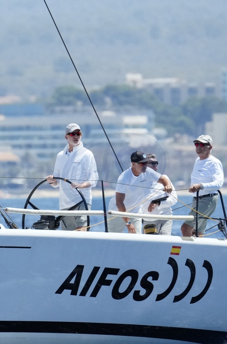 Le roi Felipe VI d'Espagne participe à la 42ème Copa del Rey à Palma de Majorque, le 30 juillet 2024. © Lalo Yasky / Bestimage King Felipe Vi seen on board of the AIFOS the Day 1 of the Copa del Rey sailing trophy during his summer holidays in Mallorca. Palma de Mallorca - July 30, 2024