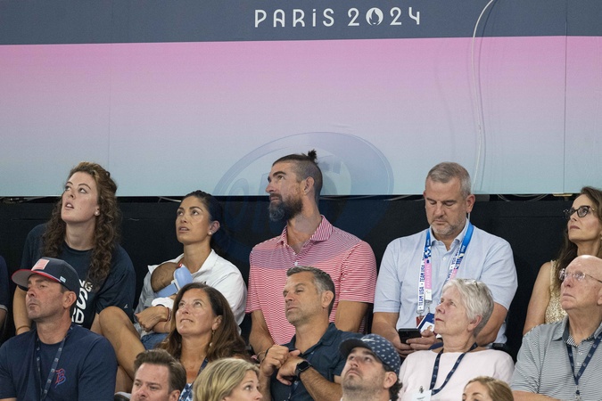 Michael Phelps et sa femme Nicole Johnson - Célébrités assistent aux épreuves de gymnastique lors des Jeux Olympiques de Paris 2024 (JO) au Palais omnisports Bercy Arena, à Paris, France, le 30 juillet 2024. © Jacovides-Perusseau/Bestimage Michael Phelps and his wife Nicole Johnson attend the gymnastics events during the Paris 2024 Olympic Games (Olympics) at Palais Omnisports Bercy Arena in Paris on July 30, 2024.