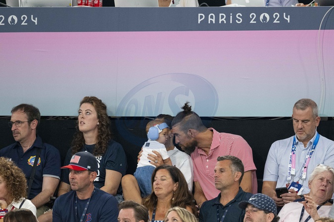 Michael Phelps et sa femme Nicole Johnson - Célébrités assistent aux épreuves de gymnastique lors des Jeux Olympiques de Paris 2024 (JO) au Palais omnisports Bercy Arena, à Paris, France, le 30 juillet 2024. © Jacovides-Perusseau/Bestimage Michael Phelps and his wife Nicole Johnson attend the gymnastics events during the Paris 2024 Olympic Games (Olympics) at Palais Omnisports Bercy Arena in Paris on July 30, 2024.