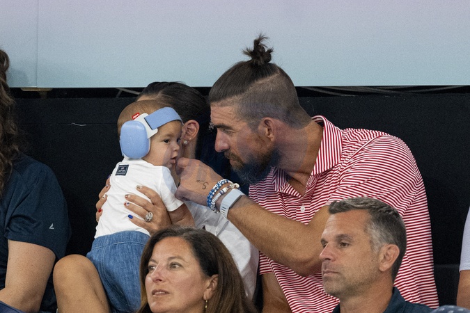 Michael Phelps et sa femme Nicole Johnson - Célébrités assistent aux épreuves de gymnastique lors des Jeux Olympiques de Paris 2024 (JO) au Palais omnisports Bercy Arena, à Paris