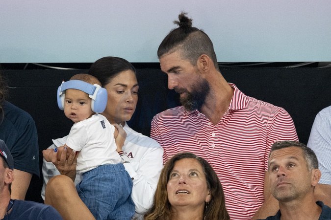 Michael Phelps et sa femme Nicole Johnson - Célébrités assistent aux épreuves de gymnastique lors des Jeux Olympiques de Paris 2024 (JO) au Palais omnisports Bercy Arena, à Paris, France, le 30 juillet 2024. © Jacovides-Perusseau/Bestimage Michael Phelps and his wife Nicole Johnson attend the gymnastics events during the Paris 2024 Olympic Games (Olympics) at Palais Omnisports Bercy Arena in Paris on July 30, 2024.