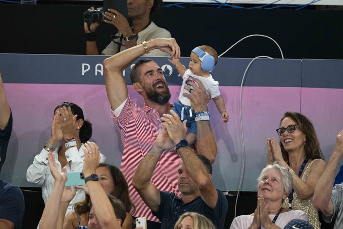 Michael Phelps et sa femme Nicole Johnson - Célébrités assistent aux épreuves de gymnastique lors des Jeux Olympiques de Paris 2024 (JO) au Palais omnisports Bercy Arena, à Paris, France, le 30 juillet 2024. © Jacovides-Perusseau/Bestimage Michael Phelps and his wife Nicole Johnson attend the gymnastics events during the Paris 2024 Olympic Games (Olympics) at Palais Omnisports Bercy Arena in Paris on July 30, 2024.