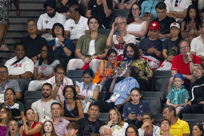 Exclusif - Anant Ambani avec sa femme et toute sa famille (Radhika Anant Ambani sa femme, Mukesh Ambani son pere, et sa mere Nita Ambani) - Célébrités assistent aux épreuves de gymnastique lors des Jeux Olympiques de Paris 2024 (JO) au Palais omnisports Bercy Arena, à Paris, France, le 30 juillet 2024. © Jacovides-Perusseau/Bestimage Exclusive - Anant Ambani with his wife and his entire family (Radhika Anant Ambani his wife, Mukesh Ambani his father, and his mother Nita Ambani) attend the gymnastics events during the Paris 2024 Olympic Games (Olympics) at Palais Omnisports Bercy Arena in Paris on July 30, 2024.