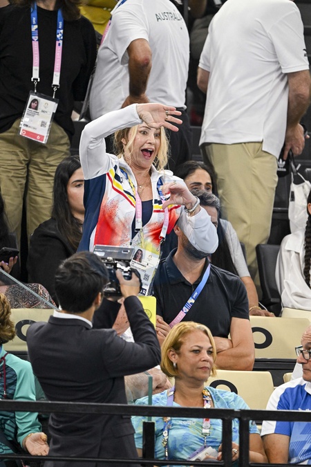 Célébrités assistent aux épreuves de gymnastique lors des Jeux Olympiques de Paris 2024 (JO) au Palais omnisports Bercy Arena, à Paris