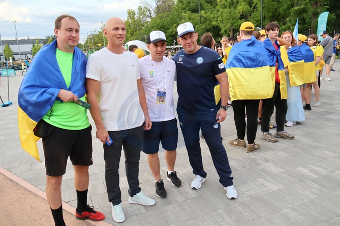 KYIV, UKRAINE - JULY 26, 2024 - Ukrainian sprint canoeist and two-time Olympic champion Yurii Cheban (2nd L) attends an event to mark the opening ceremony of the Paris 2024 Summer Olympics in the fan zone at the Expocenter of Ukraine (VDNG), Kyiv, capital of Ukraine., Credit:Pavlo Bahmut / Avalon