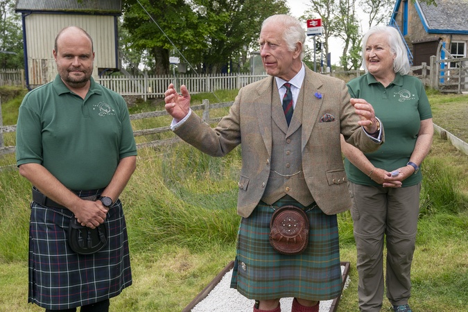 King Charles III during his visit to the Forsinard Flows Visitor Centre in Forsinard, Highland, which was recently given World Heritage Site status, to meet with Flow Country Partnership staff, local residents, families and young people. Picture date: Wednesday July 31, 2024. PA Photo. See PA story ROYAL Charles. Photo credit should read: Jane, Credit:Jane Barlow / Avalon