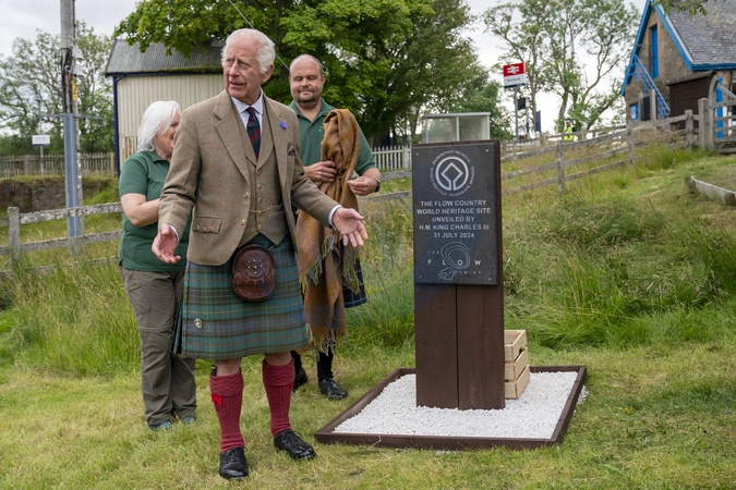 King Charles III unveils the Flow Country World Heritage Site plaque during his visit to the Forsinard Flows Visitor Centre in Forsinard, Highland, which was recently given World Heritage Site status, to meet with Flow Country Partnership staff, local residents, families and young people. Picture date: Wednesday July 31, 2024. PA Photo. See PA story ROYAL Charles. Photo credit should read: Jane, Credit:Jane Barlow / Avalon