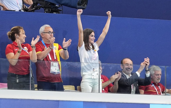 Hiszpańska królowa Letycja na trybunach meczu piłki wodnej kobiet „Hiszpania kontra Grecja” podczas Igrzysk Olimpijskich w Paryżu w 2024 r.