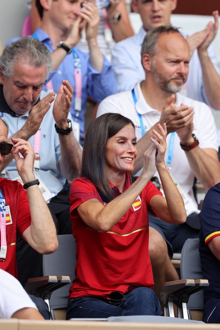 La reine Letizia d’Espagne assiste aux 1/4 de finale de tennis entre Carlos Alcaraz et Tommy Paul lors des Jeux Olympiques de Paris2024 (JO) à Roland Garros