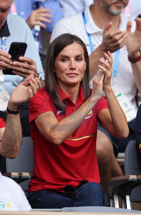 La reine Letizia d’Espagne assiste aux 1/4 de finale de tennis entre Carlos Alcaraz et Tommy Paul lors des Jeux Olympiques de Paris2024 (JO) à Roland Garros