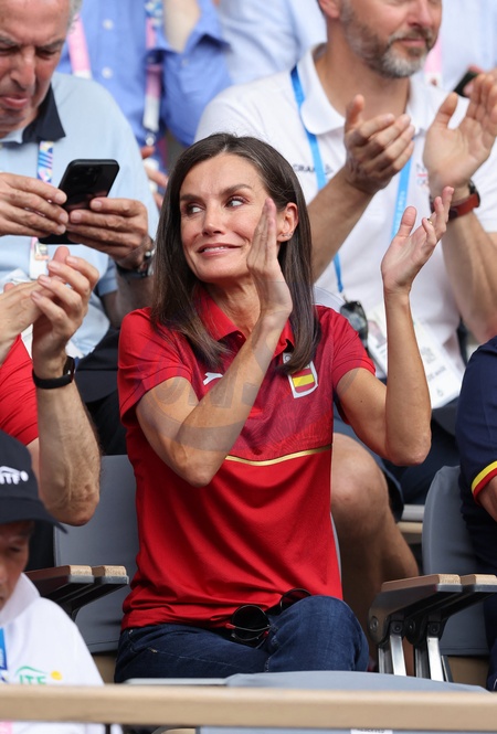 La reine Letizia d’Espagne assiste aux 1/4 de finale de tennis entre Carlos Alcaraz et Tommy Paul lors des Jeux Olympiques de Paris2024 (JO) à Roland Garros